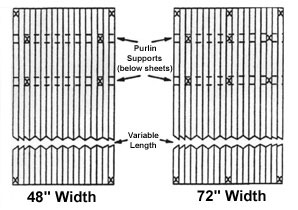 FASTENING For proper point fastening, 1" neoprene bonded washers should be used with screws. 48 inch wide sheets: Should be fastened to supports at all four corners , and at points 6" in from the edges of each purlin support. 72 inch wide sheets: Should be fastened to supports at all four corners, and at points 6" in from the edges of each purlin support and in the center of the purlin supports.